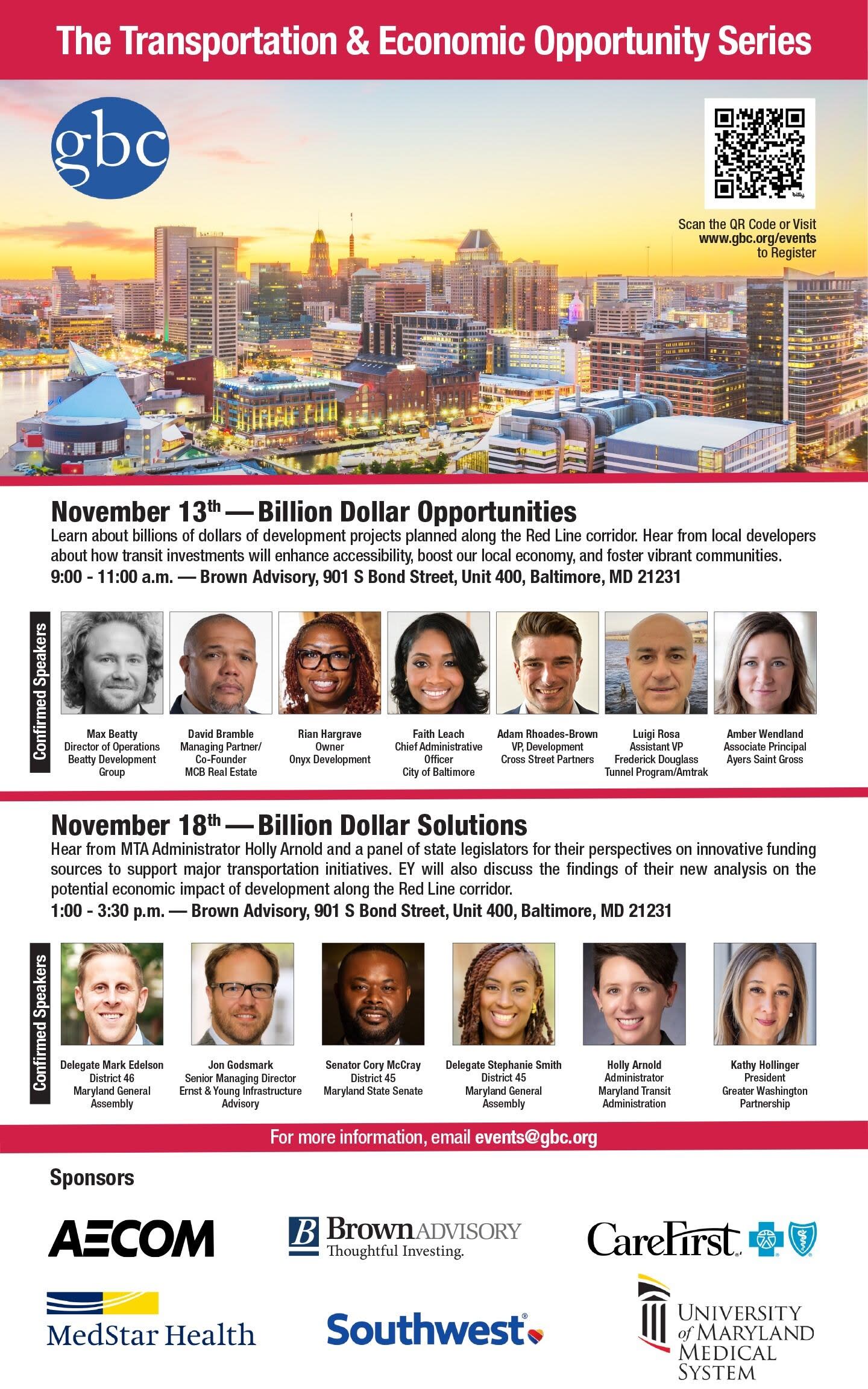 On Wednesday November 13th and Monday November 18th, GBC will host its second-ever Transportation & Economic Opportunity Series. This event will focus on the transformative economic potential of the Red Line project and its role in catalyzing meaningful economic growth. Hear from the region’s most influential business leaders and policymakers about the development projects and funding strategies associated with delivering a world-class transportation system to the Baltimore Region.